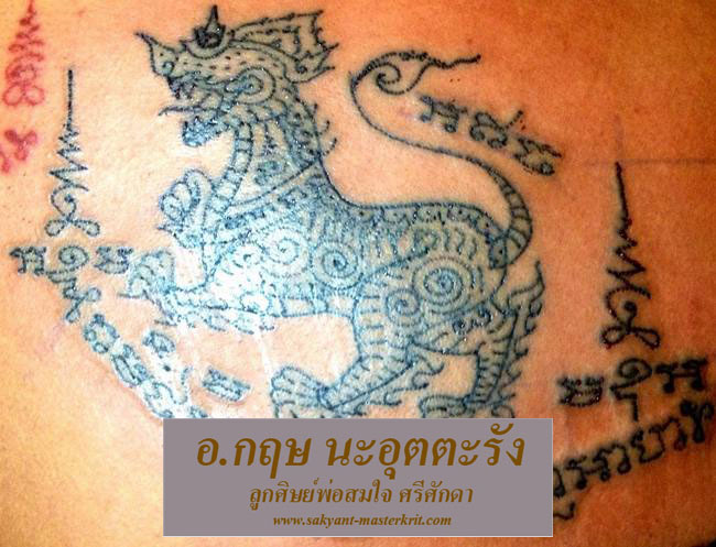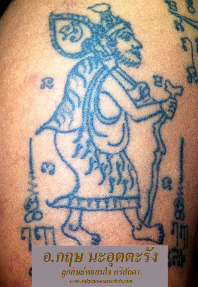 Yant Yod Na-Rue-Cha has meanings of invincibility, preventing from ghosts, all harm and danger, and providing safety. A famous person being tattooed will be even more famous.